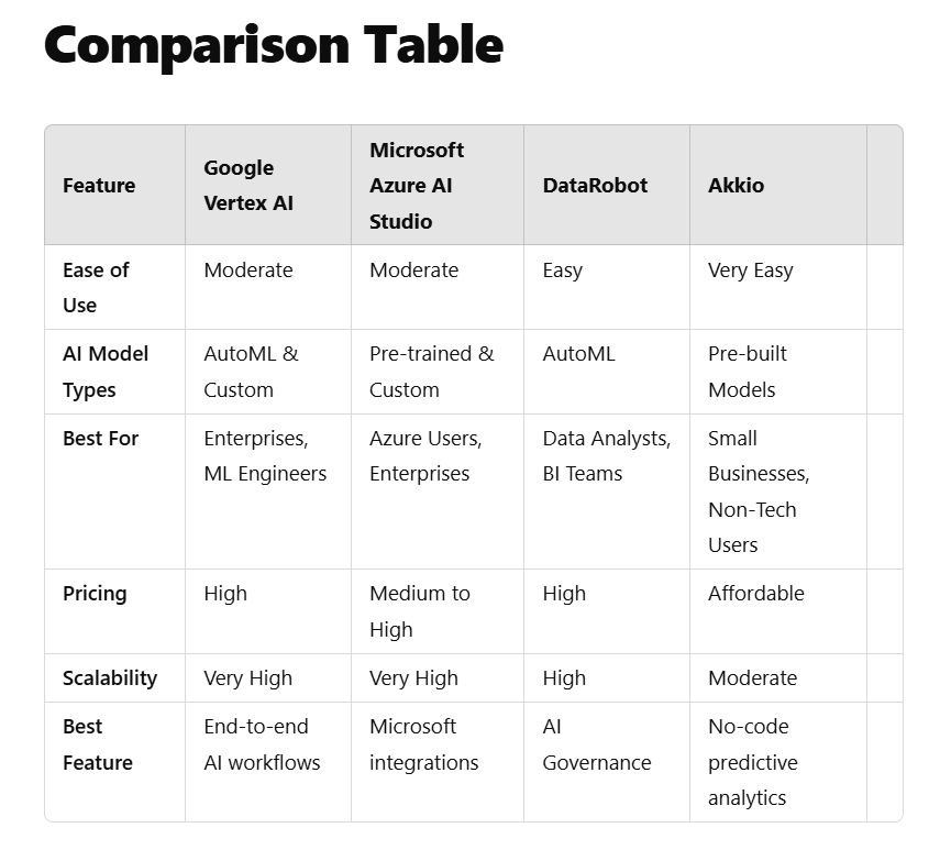 · ✔ Integration with Microsoft products (Excel, Power BI, Teams) and AutoML streamlines AI model creation.